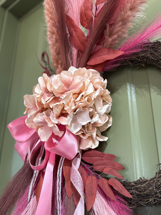 Pink & Burgundy Fall Wreath with Hydrangeas, Pampas Grass & Layered Bows