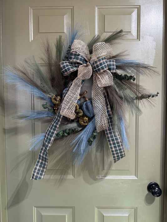 Dark Teal & Green Thanksgiving Wreath with Pumpkins, Eucalyptus & Plaid Bow