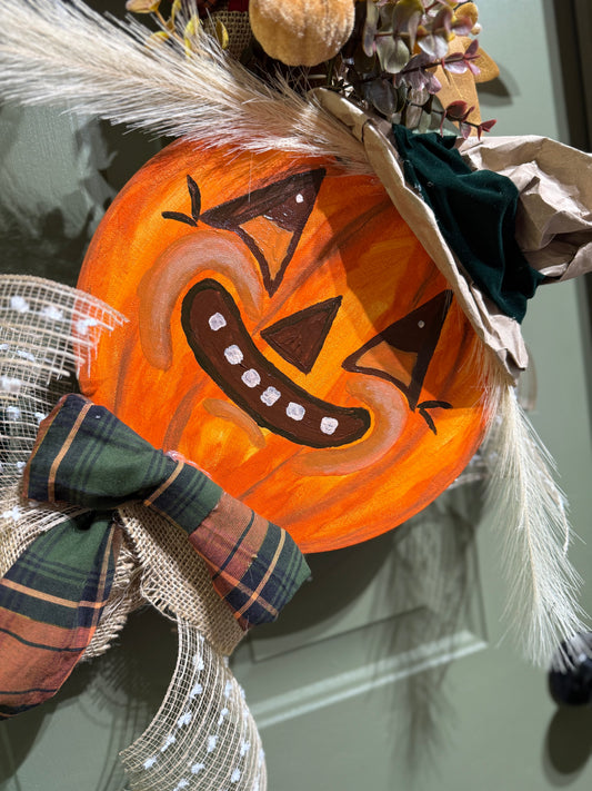 Vintage Scarecrow Fall Wreath with Velvet Bow, Pumpkins & Rustic Plaid