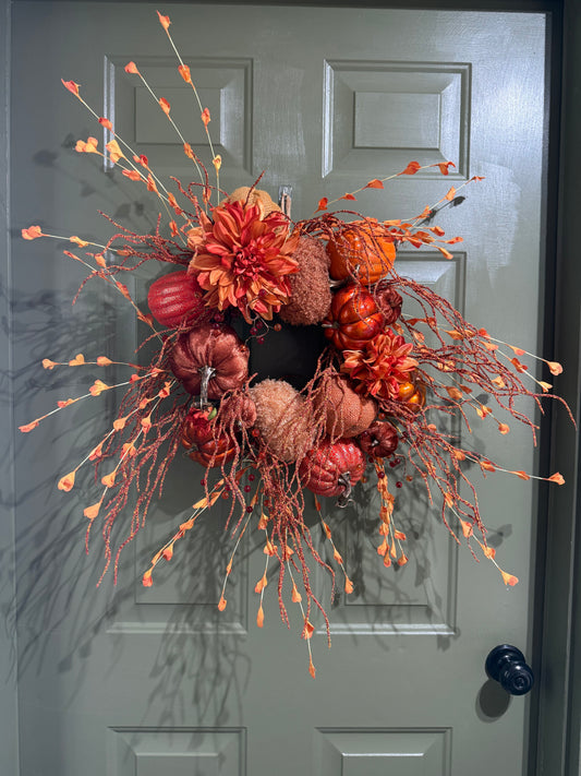 Rustic Orange Pumpkin Fall Wreath with Faux Florals