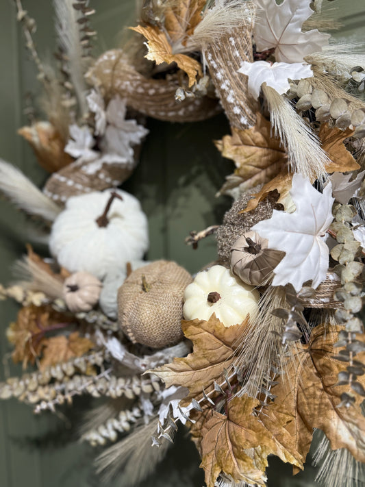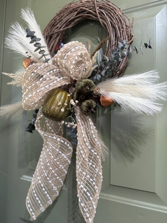 Neutral Farmhouse Fall Wreath with Tan and White Accents
