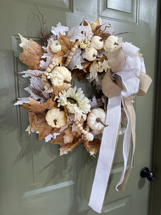 White Pumpkin & Sunflower Fall Wreath with Burlap and Beads