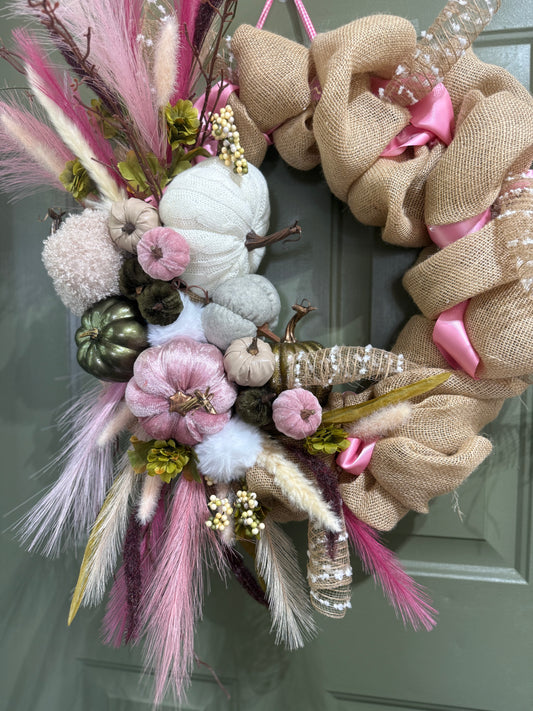 Pink Pumpkin Autumn Wreath with Burlap & Moss Green