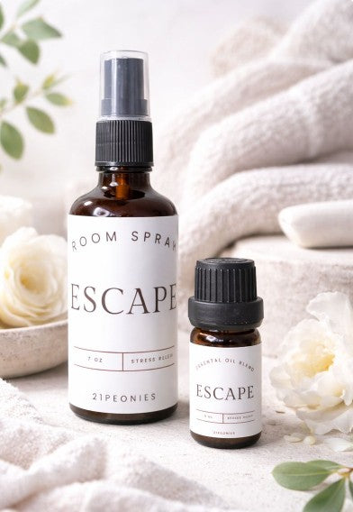 Create a complete calming experience with the Escape Bundle, featuring both the 5ml Escape Essential Oil Blend and the 7 oz Escape Room Spray. This duo pairs the deep, grounding notes of Lavender, Sandalwood, Clary Sage, and Patchouli for instant and long-lasting stress relief.