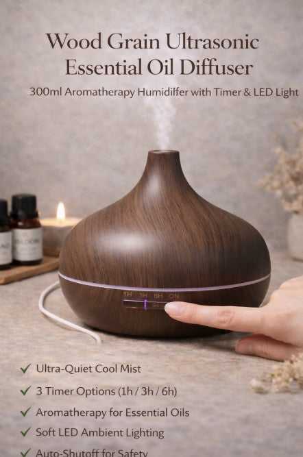 Wood Grain Ultrasonic Essential Oil Diffuser – 300ml Aromatherapy Humidifier with Timer & LED Light